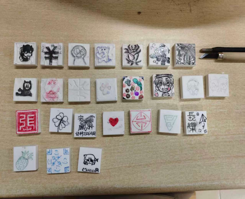 活动现场,同学们有序合理地领取制作印章的材料,展开创意设计。从写反字到运刀,每一步都认真投入,通过雕刻,勾勒等方式,让印章焕发生机。