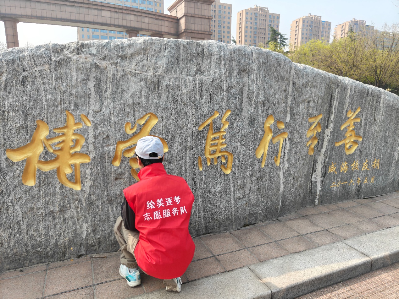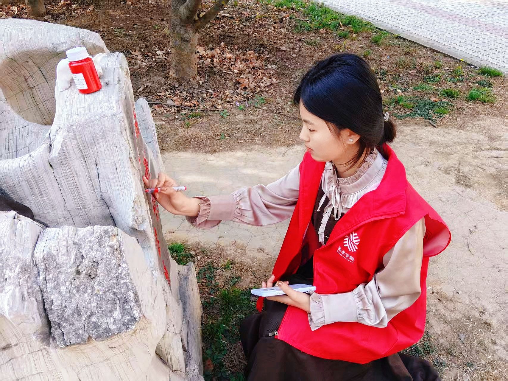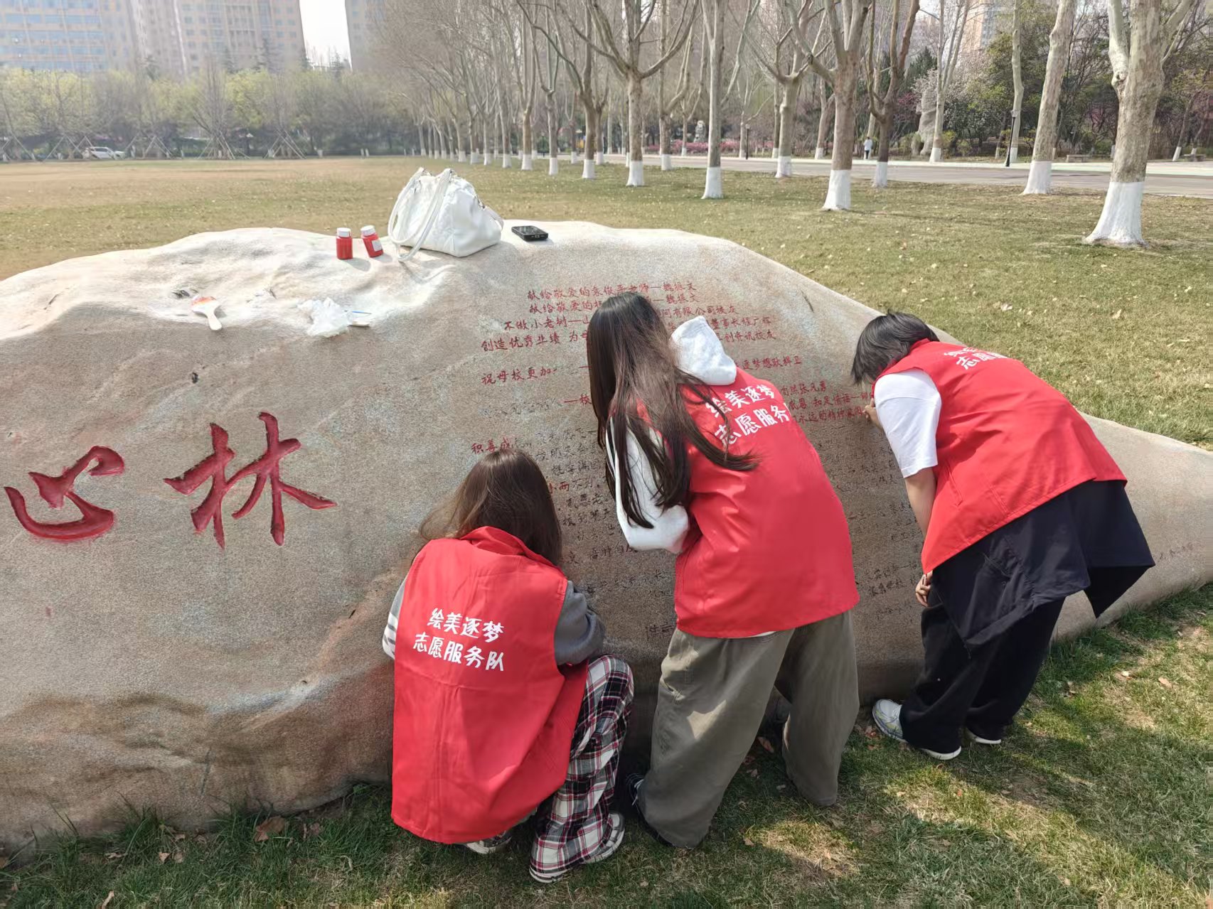 活动现场,身着“绘美逐梦志愿服务队”红马甲的志愿者们分工明确、井然有序,细致清洁石面后,反复描摹、逐层填色,让模糊不清的文字重归清晰醒目。春日暖阳下,学子们俯身专注创作的身影,成为校园中一道朝气蓬勃的动人风景。