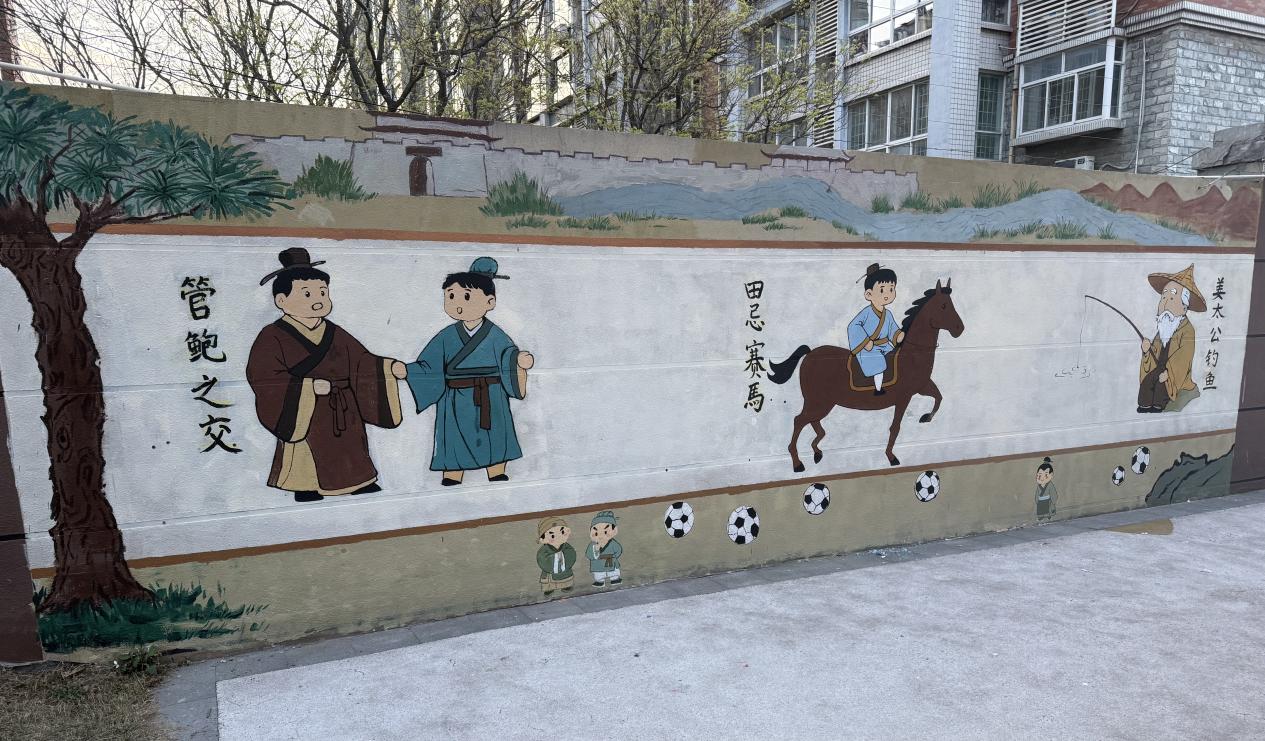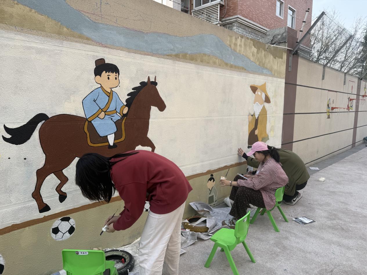活动现场,服务队成员发挥专业特长,在幼儿园墙面精心绘制古代成语主题墙绘,用色彩装点校园环境,为幼儿成长营造传统文化氛围。