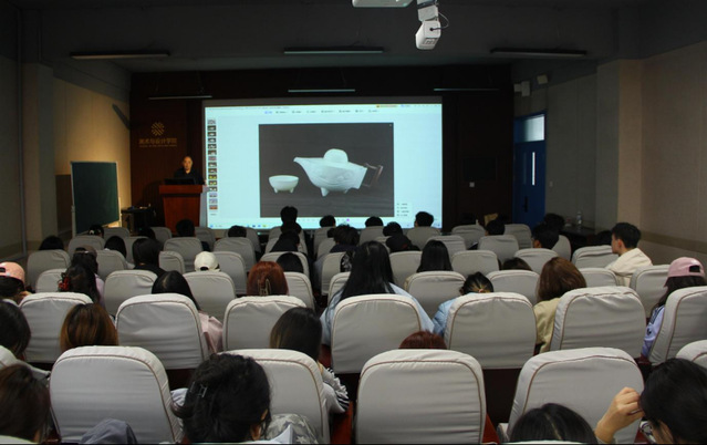 岳孝清以“日用陶瓷设计思维”为主题,结合自身丰富创作经验,系统阐述了独具特色的设计理念与实践方法。他强调,日用陶瓷设计应贴合陶瓷生产工艺,确保设计方案能够从图纸顺利转化为实物,实现艺术创作与生产实际的有机统一。他指出,构思阶段的反复推敲至关重要,并通过大量设计手稿与最终成品的对比展示,完整呈现了从灵感萌发到器物成型的全链条创作过程。在设计实践中,他主张设计的核心在于创新,要将前所未有的构想与创意,通过独特的陶瓷语言加以呈现;同时鼓励同学们从自然景物、生活物件、传统文化及建筑结构中汲取灵感,灵活运用仿生设计等手法,赋予器物鲜活生命力。针对茶壶等实用器型,岳孝清提出需精密测算容量、水流与重心,兼顾美观与实用;在造型创新的同时,要提前预判烧制过程中的形变风险,通过科学的结构设计予以规避。此外,他还分享了壶身与把手的融合设计巧思,实现功能与美学的平衡。同学们在聆听创作分享、感悟设计历程的同时被岳孝清精益求精、守正创新的工匠精神深深感染。