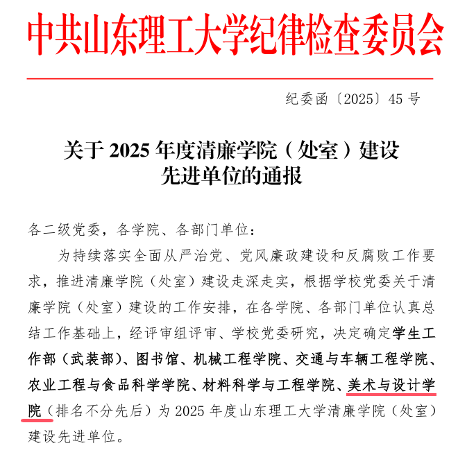 近日,学校公布《关于2025年度清廉学院(处室)建设先进单位的通报》,美术与设计学院荣获学校清廉学院(处...